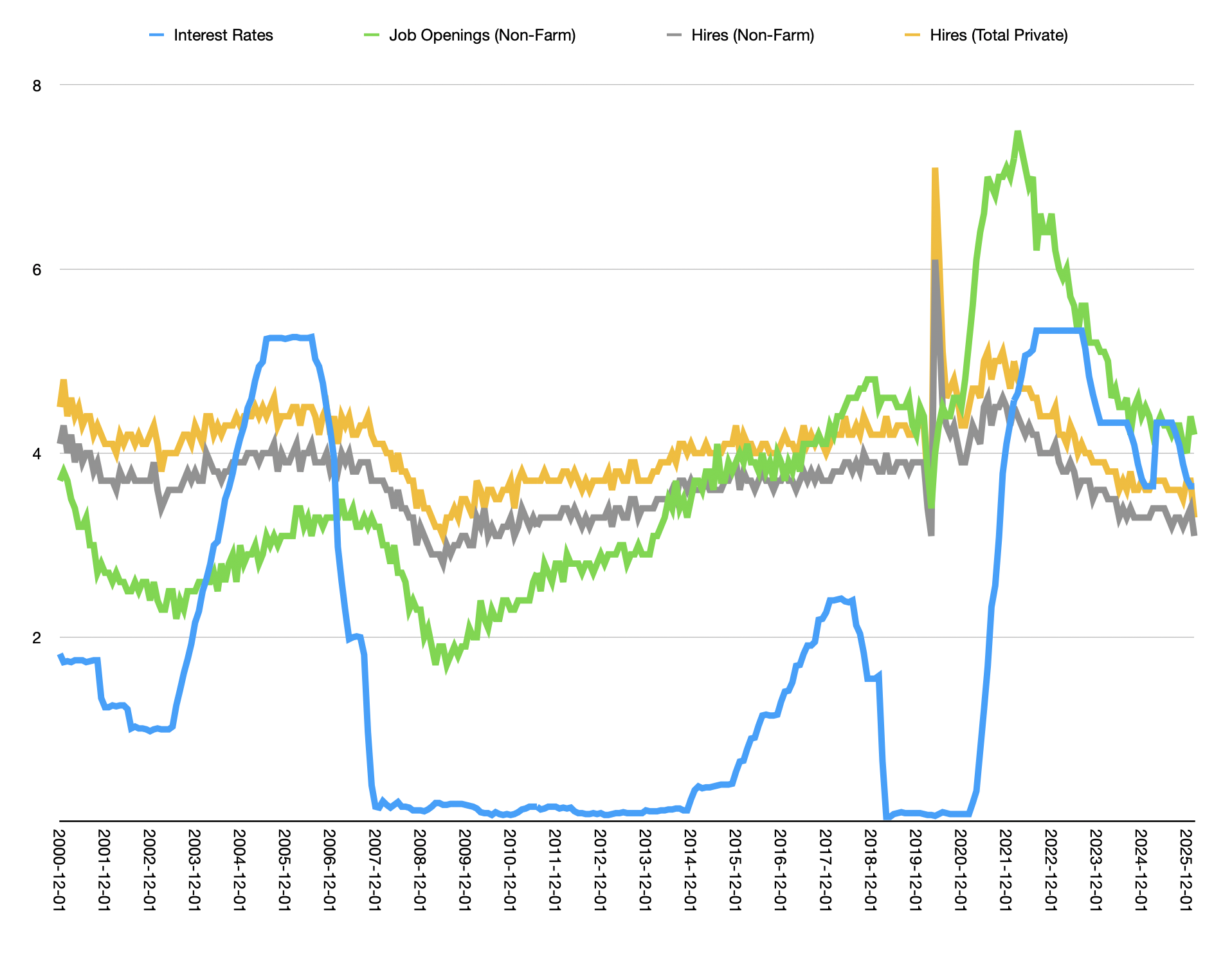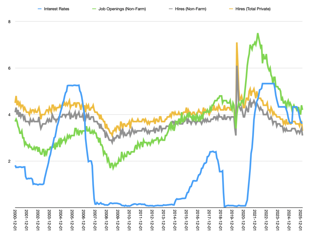 Businesses across industries stopped growing headcount three years ago. Here’s the seasonally adjusted, non-farm job openings & hires against interest rates since 2000.